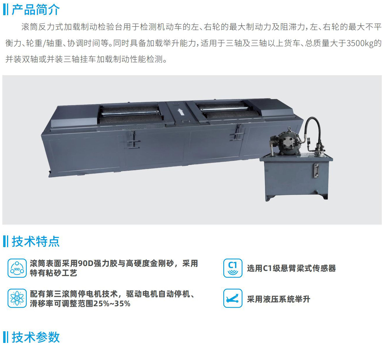 滾筒反力式加載制動(dòng)檢驗(yàn)臺(tái)用于檢測(cè)機(jī)動(dòng)車(chē)的左、右輪的最大制動(dòng)力及阻滯力,左、右輪的最大不平衡力、輪重/軸重、協(xié)調(diào)時(shí)間等。同時(shí)具備加載舉升能力,適用于三軸及三軸以上貨車(chē)、總質(zhì)量大于3500kg的并裝雙軸或并裝三軸掛車(chē)加載制動(dòng)性能檢測(cè)。