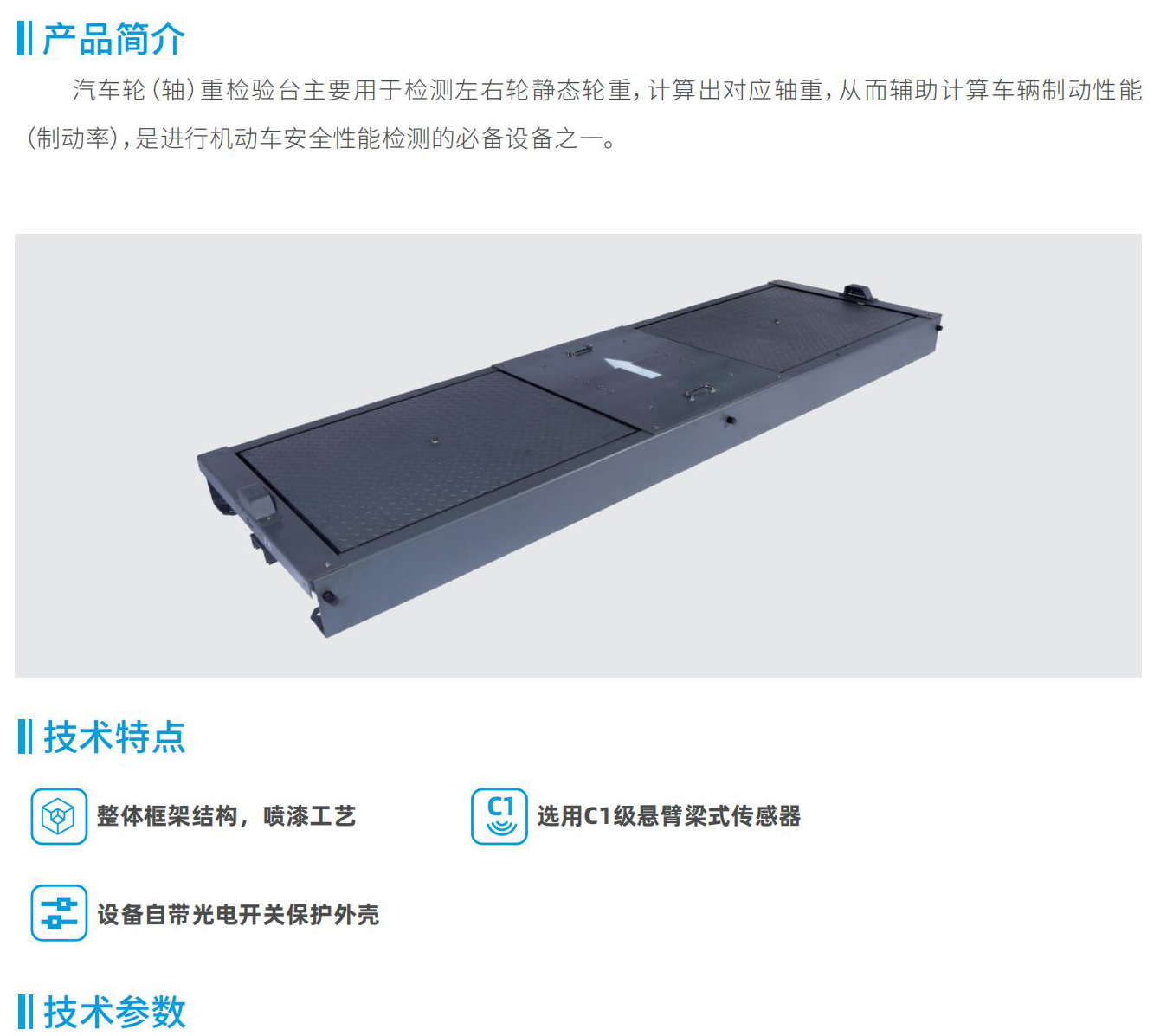 汽車輪(軸)重檢驗(yàn)臺(tái)主要用于檢測(cè)左右輪靜態(tài)輪重,計(jì)算出對(duì)應(yīng)軸重,從而輔助計(jì)算車輛制動(dòng)性能(制動(dòng)率),是進(jìn)行機(jī)動(dòng)車安全性能檢測(cè)的必備設(shè)備之一。